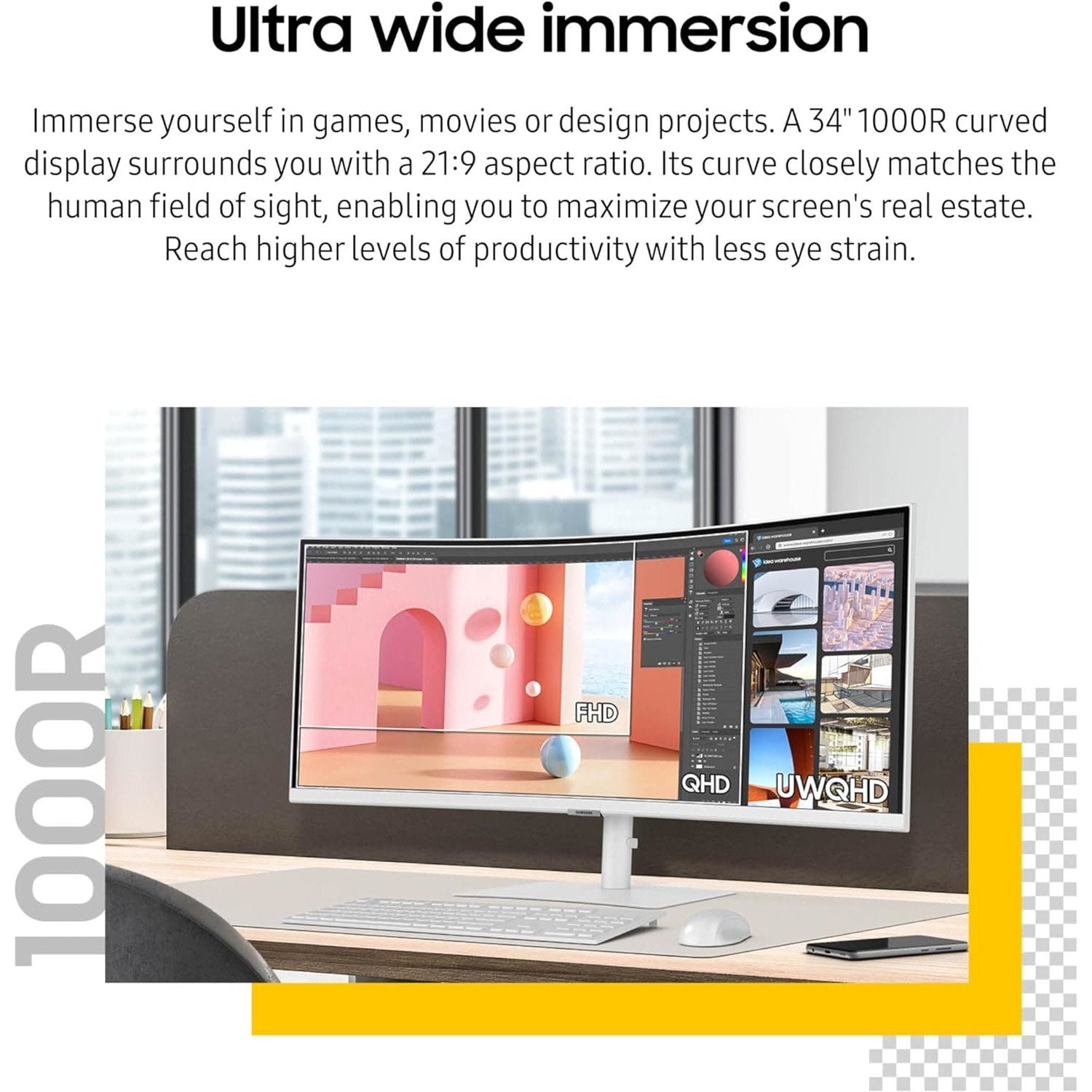 - Samsung's Ultra-WQHD Monitor with a 34" 1000R curved display surrounds you with a 21:9 aspect ratio to maximize your screen's real estate.
