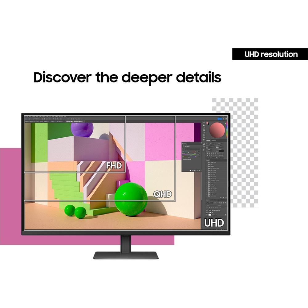 - Samsung's 37" ViewFinity S7 4K UHD Monitor with High Resolution (3840x2160) provides visual excellence with greater levels of detail and higher pixel density.